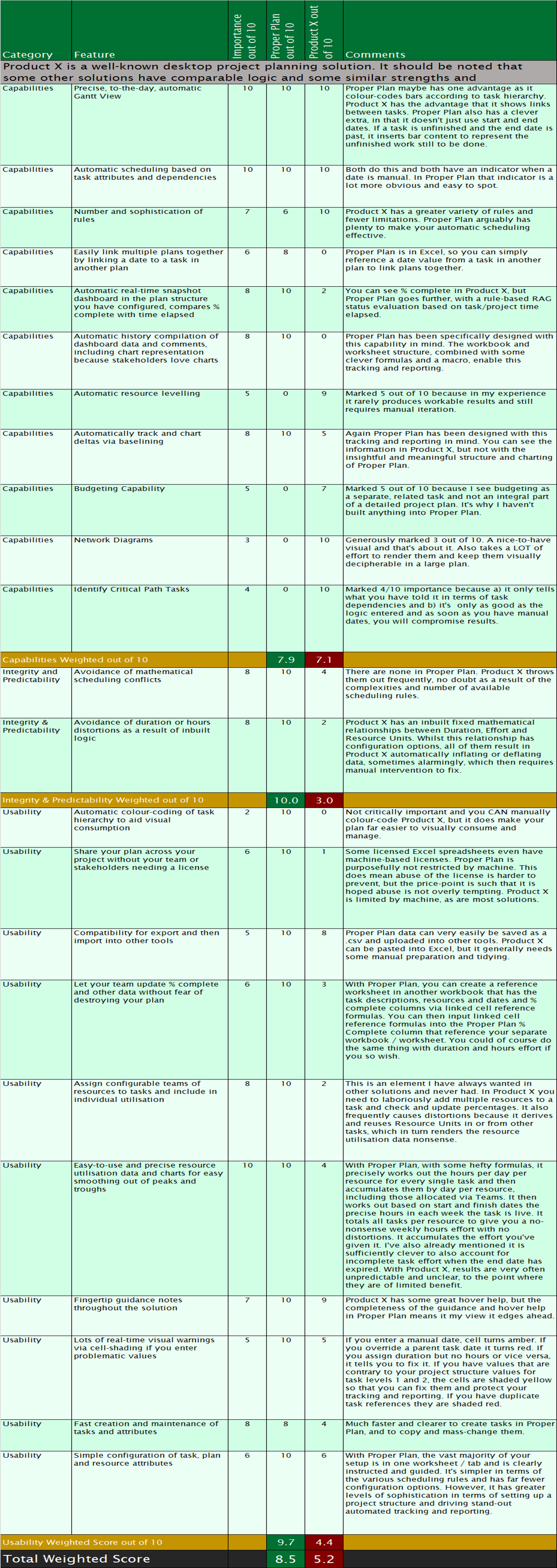 I built Proper Plan because the several other products I have used do an awful lot that I don’t need, and partly as a result of that, do a lot of the things I really need not well enough for my own satisfaction. You can read my summary beneath the analysis, which of course I have tried to make as unbiased as possible. Of course it is subjective and I am bound to carry some bias.