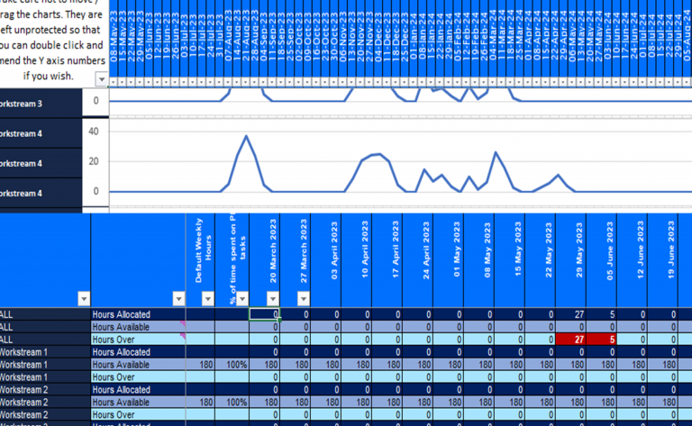 The line graphs you see update real-time based upon your plan content for every resource, so that you can identify peaks and troughs you may want to address to smooth out your resource workload. Once you have configured available hours per resource, you get the real-time data that tells you for each week and resource if the hours exceed available, and it even highlights those where the excess is greater than 5 hours.