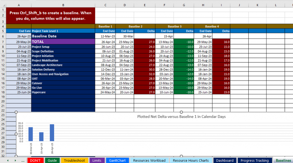 - Another delight for your stakeholders, create a baseline in a second for overall and task level 1 up to 30 times and automatically track the deltas and ongoing schedule fluctuation over the duration of the project