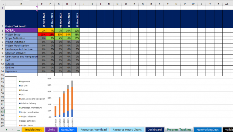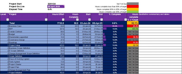 The dashboard tab is a real-time rendering of project health, with an automated Red, Amber, Green status for task levels 1 and 2 and the overall project. It compares percentage complete with target hours complete to date for each category and scores them red for more than 10% behind , amber for between 5% and 10% behind and green for more than 95% of target hours to date complete. The only required setup is some numbering of the task levels in the Validations tab.